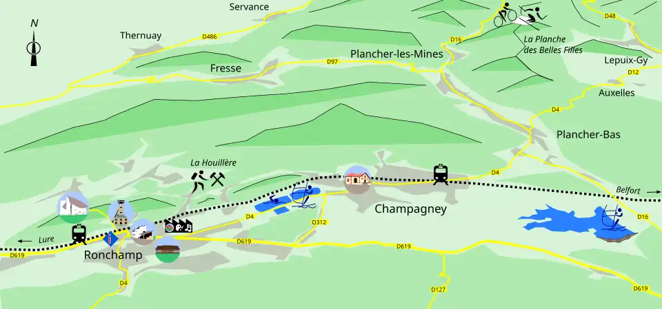 Les gares de Ronchamp et de Champagney, sur la ligne de Paris-Est à Mulhouse-Ville sont desservies par le réseau TER Franche-Comté qui effectuent des missions entre les gares de Vesoul et de Belfort ou de Montbéliard[16]