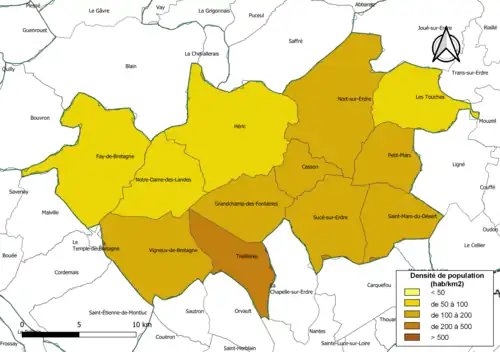 « Lors du dernier conseil communautaire de la CCEI (Communauté de communes d'Erdre et Isac), l'évolution intercommunale était au centre des débats, car les démarches engagées en vue du regroupement de la CCEI, de la CCEG (Erdre et Gesvres) et des communes issues du District de Blain (Fay-de-Bretagne, Héric et Notre-Dame-des-Landes) sont définitivement finalisées. » - ↑ « Chiffres-clés du territoire de l'intercommunalité. », sur le site de l'Insee (consulté le ).