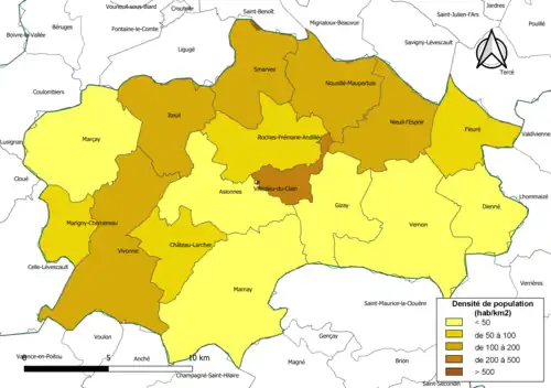 Carte des densités de population (millésimée 2016) des communes de la communauté de communes des Vallées du Clain. Composition en communes au [3].