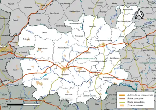 Située au sud-ouest du département des Côtes-d'Armor, la communauté de communes du Kreiz-Breizh regroupe 23 communes et s'étend sur 699 km2[3].