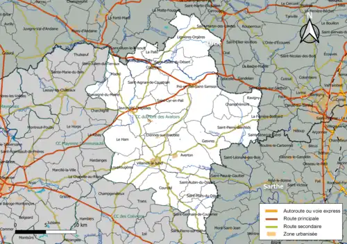 - traversée par la nationale 12 et à proximité de l’A28 (Alençon – Le Mans – Tours), l’A11 (Paris – Le Mans – Nantes) et l’A81 (Rennes).