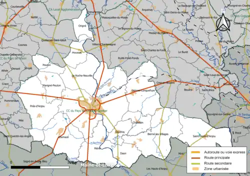 - ↑ Ce nombre était de 24 avant la création des communes nouvelles de Bierné-les-Villages, Château-Gontier-sur-Mayenne, Gennes-Longuefuye, Prée-d'Anjou et La Roche-Neuville.