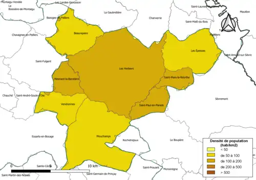 Carte des densités de population (millésimée 2016) des communes de la communauté de communes du Pays des Herbiers. Composition en communes au [4].
