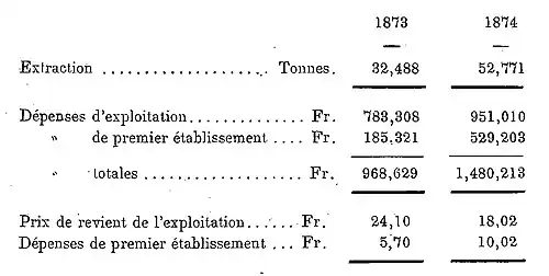 En 1874, l'extraction atteint 52 771 tonnes, et donne un bénéfice de 73 000 francs, grâce au prix élevé des charbons, qui est de 24 à 25 francs la tonne[D 4]. Elle a lieu presque exclusivement au nouvel étage de 307 mètres, celui de 260 mètres ayant été abandonné. Une somme de près de 350 000 francs est employée pendant cette année en frais de premier établissement, machines, bâtiments, construction de 64 maisons... et une autre de 130 000 francs à la préparation du nouvel étage d'exploitation[D 4].