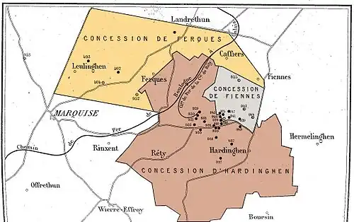 Le 24 juin 1870, le Tribunal de Boulogne, sur les sollicitations des obligataires de la Société des Mines de Fiennes et Hardinghen en liquidation, met en vente par adjudication publique, la concession d'Hardinghen seule. La concession de Fiennes est vendue ultérieurement et séparément, le 23 février 1875[D 1].