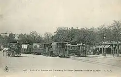 Le tramway sur la place du Château de Saint-Germain-en-Laye au début du XXe siècle. Il était à l'époque tracté par de petites locomotives système Francq. | |