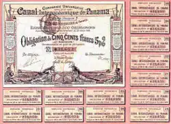 La Compagnie universelle a émis entre 1882 et 1888 sept séries d'obligations, sous la forme de titre au porteur de la société universelle du Canal intraocéanique du Panama. À l'origine, pour ne pas effrayer les souscripteurs, Ferdinand de Lesseps avait annoncé un coût de construction du canal de Panama de 600 millions de francs. À la dernière souscription, elle avait dépensé, en y ajoutant le capital en actions, 1 335 000 000 francs. À court d'argent, la Compagnie universelle lance une nouvelle série d'obligations le mais qui n'a rencontré aucun succès. Elle doit alors arrêter ses paiements.