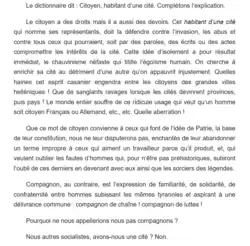 « Deux mots sur cette épithète de compagnon qui sert aux anarchistes à se désigner entre eux. Citoyen était le mot républicain, j'allais dire révolutionnaire : mais citoyen impliquait un droit de cité (civitas, civis), un contrat consenti avec un pouvoir directeur : citoyen ne convenait qu'à des esclaves – au point de vue anarchiste. Il fallait trouver autre chose. On créa le terme compagnon, qui, de fait, n'engage à rien. »
