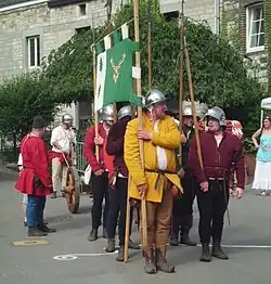 Militaires: la volonté étant de coller au plus prêt de la vérité historique, en représentation publique, les combats sont remplacés par des entraînements. Les journées lors des représentations sont rythmées par des entraînements à l'arme d'hast et des duels à l'épée.