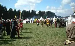 ↑ La création du concept du rassemblement médiéval est difficilement datable. Cependant, La Geste de Montaiguillon (association de reconstitution médiévale du château de Montaiguillon, loi 1901) réalise 14 rassemblements médiévaux bisannuels au sein des ruines entre 1995 et 2002. L'événement ne sera plus reconduit à la suite d'un meurtre commis dans le château quelques semaines après cette dernière édition. Les membres de la Verte Tente entendent parler du rassemblement de Montaiguillon fin 1999, après la création de leur propre événement.