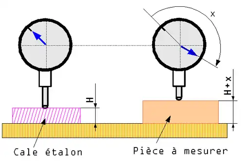 Pour effectuer une mesure on fait un point zéro à l'aide par exemple d'une cale étalon. Le corps du comparateur étant fixe on place la pièce à mesurer sous le comparateur qui indique alors la différence entre le point de référence et la dimension de la pièce mesurée.