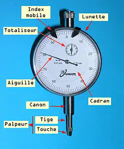 Le comparateur est constitué d'une tige mobile en translation. Le déplacement de cette dernière est transmis à un dispositif mécanique transformant la translation de la tige en rotation de l'aiguille. L'angle total de rotation est proportionnel au déplacement en translation de la tige.