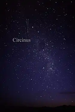 Le compas est une annexe au pied du Centaure. Partant de alpha et bêta du Centaure, la paire d'étoiles que l'on voit ~5° à l'Est est β et γ Cir, et l'étoile brillante située à ~5° au Sud de alpha du Centaure est α Cir.