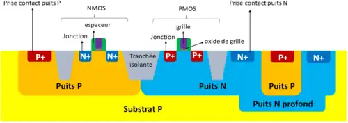 Les transistors NMOS sont placés dans des puits P et les transistors PMOS sont placés dans des puits N. Ces puits sont polarisés par des prises de contacts appelées "tap cells" en anglais. Les puits P ont la même polarité que le substrat P, ils sont donc tous connectés au même potentiel électrique. Au contraire, un puits N peut être polarisé à un potentiel supérieur au substrat P indépendant des autres puits N. Pour permettre cela dans le cas d'un puits de type P, un puits N profond peut être utilisé pour le dissocier du substrat P [2],[3].