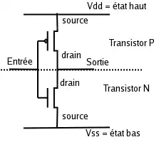 Pour expliquer le fonctionnement, on peut prendre par exemple le circuit le plus simple existant, l'inverseur CMOS (fonction NON), composé de deux transistors, un N et un P. La table de vérité de l'inverseur est la suivante :