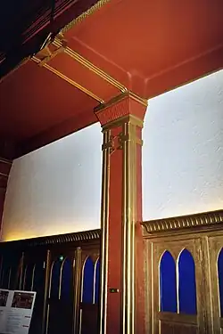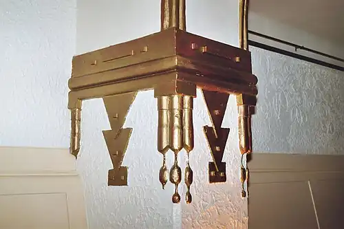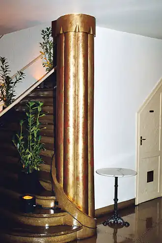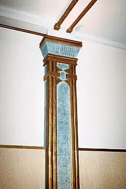 Cette décoration utilise massivement les stucs dorés et des formes d'inspiration égyptienne telles des colonnes fasciculées (comme la colonne dorée de l'escalier) ou des pilastres de couleur turquoise ou marron bordées de nervures dorées et surmontées de chapiteaux proto-doriques.