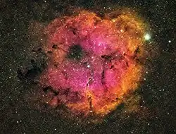 IC 1396 est une grande région HII qui est également partiellement visible en lumière visible. Sa luminosité est due à l'excitation de ses gaz par le vent stellaire de la géante bleue HD 206267, appartenant à l'association Cepheus OB2. L'expansion de cette région HII semble avoir créé un grand anneau de gaz moléculaire d'un rayon d'environ 12 parsecs, sur une période d'au moins 3 millions d'années[36]. La structure annulaire s'étend sur environ 3° et est entourée d'un grand nombre de globules sombres, au sein desquels de nouvelles étoiles se forment probablement en raison de la compression par ionisation, du front de choc des vents stellaires et de la pression de rayonnement. Les plus gros globules sont situés sur le côté nord-ouest de la région nébuleuse[37].
