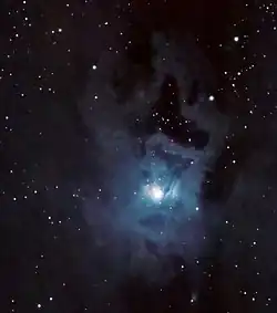NGC 7023 est une nébuleuse par réflexion illuminée par la jeune étoile massive HD 200775 et un groupe d'étoiles plus faibles. Elle a été découverte par William Herschel en 1794. Au centre de la nébuleuse se trouve un petit amas ouvert d'étoiles présentant des raies d'émission Hα variables[53], plus quatre étoiles T Tauri. Selon certaines études, l'étoile variable PV Cephei, située à environ 10 parsecs à l'ouest du nuage, aurait été expulsée du nuage lui-même il y a environ 100 000 ans[54].