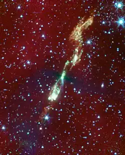 LDN 1157 est un objet Herbig-Haro constitué d'un jet de matière particulièrement puissant. Il a été étudié sur plusieurs lignes d'émission, telles que CO, SiO, H, CH3OH et a été indiqué comme le prototype de jets chimiquement actifs[61]. Des modèles d'ondes de choc de gaz ont été utilisés pour étudier comment la structure observable s'est formée, tandis que les observations de la ligne d'émission de méthanol suggèrent la présence d'une couche de gaz chauffée dans le disque d'accrétion[62]. On pense que la protoétoile a quelques milliers d'années et, selon les scientifiques de la NASA, ressemble à ce à quoi notre système solaire devait ressembler il y a des milliards d'années, lors de la formation de notre Soleil[63].