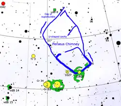 L’environnement entourant la région est profondément influencé par les phénomènes de formation d’étoiles passés et présents. Un grand nombre de structures galactiques sont en effet directement liées à la présence du complexe nébuleux. En particulier, la région entourant W4 a été étudiée en détail en raison de la présence d’une gigantesque superbulle s’étendant vers le nord, bien au-dessus du plan galactique. Cette bulle, cataloguée comme Ced 8, a été surnommée Perseus Chimney (littéralement « Cheminée de Persée ») en raison de sa forme apparemment ouverte aux latitudes galactiques les plus septentrionales, et n'a été découverte qu'à la fin des années 90, grâce à des images prises dans la bande de l'hydrogène neutre (HI) puis dans Hα[35],[36]. La partie où le gaz est le plus dense peut être identifiée dans le secteur le plus proche du complexe nébuleux W4, tandis qu'à mesure que l'on monte vers des latitudes galactiques plus élevées, le gaz devient plus raréfié et la bulle prend une forme en « U », ouverte seulement en apparence vers le bord le plus externe. Le diamètre maximal à ce stade est d'environ 115 pc (∼375 al)[35]. Une étude de 2007 a montré que la partie supérieure de la superbulle a une paroi mince et n'a donc pas encore évolué vers une cheminée (une ouverture dans le milieu interstellaire qui, depuis les régions situées sur le plan galactique, atteint jusqu'aux bords du disque galactique, s'ouvrant vers l'extérieur), mais elle serait probablement en train d'évoluer vers une telle structure[37]. Son âge, dérivé de modèles de sa dynamique, a été estimé à 2,5 Ma, ce qui se situe dans la période comprise entre 1 et 3 Ma, ce qui semble être l'âge de l'amas IC 1805[38].