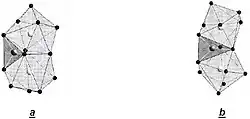 Pour obtenir une description complète, il est nécessaire de considérer l'arrangement dans l'espace de ces deux types de polyèdres. Ceux-ci s'assemblent de deux façons différentes : par les faces ou par les arêtes (figure F). Les formes que l'on obtient alors se répartissent dans l'espace pour remplir la maille cristalline de dimension 2a x 2a x 2a.