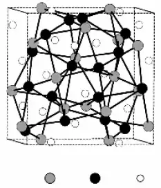 Les composés 334 cristallisent dans une structure cubique complexe de groupe d'espace I43d. Pour décrire celle-ci, il est nécessaire de considérer une maille de volume 2a x 2a x 2a (avec a : paramètre de maille) comprenant 40 atomes [A]. Ainsi, la formule chimique fait référence à 10 atomes, soit une demi-maille élémentaire en volume. Ces composés sont en fait une version remplie d'une structure similaire dont l'archétype est le composé Th3P4[7]. La structure cristalline du composé Y3Au3Sb4 (a = 9,818 A à 300 K) est illustrée figure A :