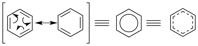 Le modèle développé par Kékulé pour le benzène consiste en deux formes mésomères, qui correspondent aux liaisons doubles et simples changeant de positions. Une autre représentation est celle de la liaison π au-dessus ou sous l'anneau. Ce modèle représente plus correctement la position de la densité d'électron dans l'anneau aromatique.