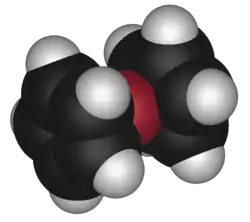 - des complexes de cyclopentadiényle mixtes (ηn-CnHn)(η5-C5H5)M, dont (η7-C7H7)(η5-C5H5)Ti et (η5-C5Ph5)(η5-C60)Fe (« bucky ferrocène ») où le ligand fullerène C60 agit comme un analogue de cyclopentadiényle[5] ;