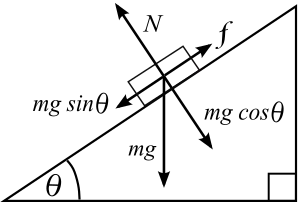 Le cas d'un corps situé sur un plan incliné est un exemple classique faisant intervenir les composantes d'une force. Dans cette situation, les forces concernées sont le poids (), le poids apparent () et le frottement ().