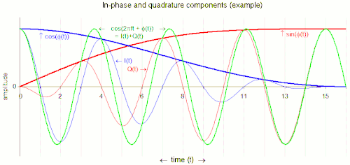 Un signal sinusoïdal modulé peut être décomposé en deux sinusoïdes modulées en amplitudes, ces deux sinusoïdes étant en quadrature, c'est-à-dire déphasées d'un quart de cycle (90 degrés ou π/2 radians). Ces deux sinusoïdes sont nommées en phase (I), et en quadrature (Q), décrivent leurs relations avec l'amplitude et la modulation de phase de la porteuse. Les trois sinusoïdes ont la même fréquence centrale[1].