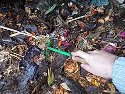 Le contrôle de la température du tas par un thermomètre de couche permet d’observer l’évolution de la température au cœur du compost. La température permet de confirmer l’activité qui y règne[22]. Si la température est trop élevée, il est utile d’aérer le compost ; si elle est trop basse, il est utile de rajouter de la matière organique fraîche (épluchures de légumes, herbe tondue…) et si nécessaire de l’activateur de compost afin de redynamiser l’activité des bactéries. Un bâton enfoncé au centre du tas permet d'effectuer ce contrôle : s’il est chaud et humide, le processus fonctionne bien ; s’il est froid et sec, il faut ajouter de l’eau et de la matière verte ; s’il est froid et détrempé, il faut ajouter de la matière brune et l’aérer davantage ; s’il dégage une odeur d’ammoniaque, ajouter de la matière carbonée[3].
