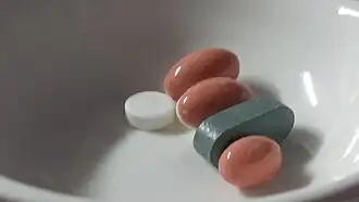 Le comprimé est enrobé, pour obtenir un effet particulier (comme la gastro-résistance) ou pour cacher la couleur ou un goût désagréable ou encore, avoir une couleur « commerciale »[15], par exemple le Viagra est bleu de la couleur du logo du laboratoire qui le commercialise. Le comprimé est lisse et brillant. - Comprimés Particuliers