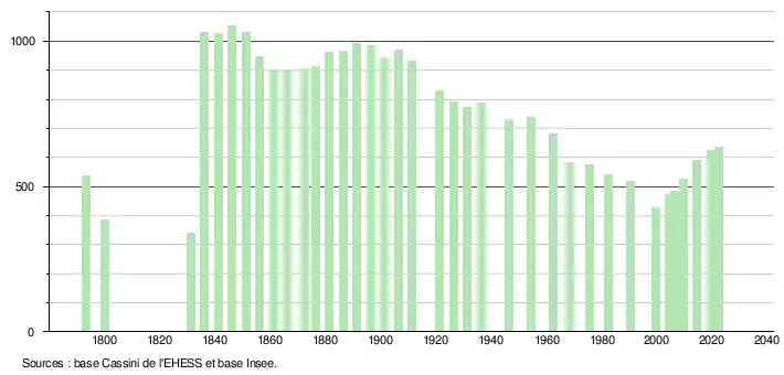 L'évolution du nombre d'habitants est connue à travers les recensements de la population effectués dans la commune depuis 1793. Pour les communes de moins de 10 000 habitants, une enquête de recensement portant sur toute la population est réalisée tous les cinq ans, les populations de référence des années intermédiaires étant quant à elles estimées par interpolation ou extrapolation[12]. Pour la commune, le premier recensement exhaustif entrant dans le cadre du nouveau dispositif a été réalisé en 2004[13].
