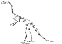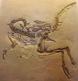 Compsognathus (signifiant « mâchoire élégante ») est un genre de petits dinosaures carnivores de l'ordre des saurischiens, du sous-ordre des théropodes et de la famille des compsognathidés d'environ un mètre de long. Deux fossiles ont été découverts : l'un en Bavière, en Allemagne dans les années 1850, sous le nom de longipes et l'autre dans le sud de la France en 1972 sous le nom de corallestris dans des couches attribuées au début du Tithonien, au Jurassique supérieur, de -155 à -150 millions d'années, mais on s'aperçut ensuite qu'il s'agissait de la même espèce et aujourd'hui, Compsognathus longipes est la seule espèce reconnue. Pour tous les fossiles, le processus taphonomique de fossilisation montre un milieu lagunaire ou lacustre calme, propice à la conservation des détails[1].