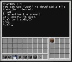 lua est exécutée.Une turtle est un bloc d'ordinateur mobile ; une sorte de robot programmable. Une turtle peut se déplacer en utilisant du carburant tel que du charbon, de la lave ou d'autres objets Minecraft combustibles. Les turtles peuvent être programmées et utilisées comme des ordinateurs normaux, mais ont un écran plus petit et une petite quantité de stockage « physique » (inventaire) pour les blocs et les objets du jeu. De plus, les turtles peuvent être équipées d'outils et d'armes tels que des pioches et des épées pour miner des blocs et tuer des monstres.
