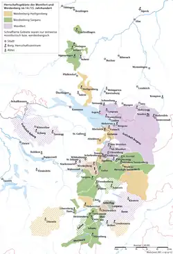 Le comte Hugues de Werdenberg-Heiligenberg († 1280) est un confident du roi Rodolphe Ier de Habsbourg ; il a pu accumuler plusieurs domaines, dont la ville de Rheineck et la zone de Tamins, les châteaux de Freudenberg et de Greifenstein, ainsi que le bailliage sur l'abbaye de Pfäfers avec le château de Wartenstein. Ses descendants se lancèrent dans une querelle avec leurs cousins de la lignée de Montfort-Feldkirch qui permettait aux Habsbourg de prendre pied sur la région du Vorarlberg. La branche de Heiligenberg s'éteint en 1428 ; l'héritage passa successivement entre les mains de la famille von Sax et de la maison von und zu Fürstenberg.