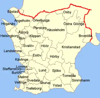 Le comté de Scanie est subdivisé en 33 communes (kommuner) au niveau local :