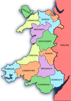 | Merioneth | 9 districts[34] | 1 709,34[35] | 39 007[35] | 23 | ||