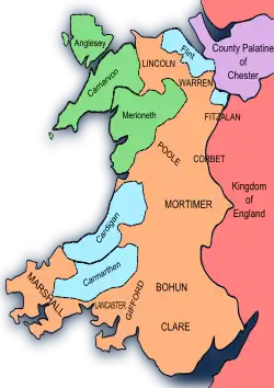 En 1254, le prince Édouard reçoit de son père Henri III le comté de Chester. À proximité de son territoire se trouve la principauté de Gwynedd, ultime région détenue par un chef gallois depuis 1255 en la personne de Llywelyn ap Gruffudd, par ailleurs reconnu prince de Galles par le roi d’Angleterre et les magnats du pays de Galles à la suite du traité de Shrewsbury conclu le . Au sens de ce pacte, il est cédé au prince de Galles le Perfeddwlad, une contrée localisée entre Chester et la Conwy comprenant les cantrefi de Dyffryn Clwyd, de Rhos, de Rhuvoniog et de Tegeingl, tandis que la main d’Éléonore de Montfort lui est promise. Toutefois, à son retour de France et dans l’optique du mariage avec Llywelyn, cette dernière est retenue par Édouard Ier en 1276. Le roi soumet la libération d’Éléonore à la signature d’un accord — le traité d’Aberconwy — dans lequel Llywelyn doit accepter de lui prêter hommage et restituer le Perfeddwlad. Dès lors, une fois la ratification du traité acquise, l’ensemble de ce territoire est aménagé sur le modèle des shires du royaume d’Angleterre et soumis à la loi anglo-normande[3].