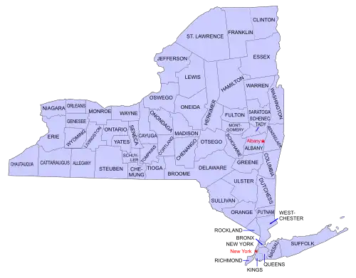 L'État de New York est divisé en 62 comtés (counties). Cinq des comtés de l'État coïncident avec les cinq arrondissements (boroughs) de la ville de New York :
