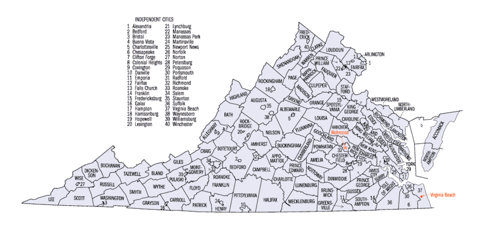 Cette double organisation, mise en place progressivement à partir de 1871, est spécifique à l'État de Virginie. En effet seules 42 municipalités ont la qualité de cité indépendante aux États-Unis, dont 39 sont situées en Virginie. Les trois autres sont Baltimore dans le Maryland, Saint-Louis dans le Missouri, et Carson City dans le Nevada.
