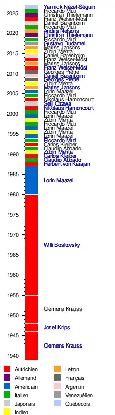 Depuis 1987, l'orchestre sélectionne un chef différent d'année en année[5]: avec sept directions entre 1993 et 2025, c'est l'Italien Riccardo Muti qui en détient le plus dans ce nouveau format[6].