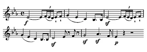 Ce n'est que dans l′exposition de cent mesures qui suit que l'orchestre présente le thème principal, dont l'allure donne à l'œuvre son caractère martial.