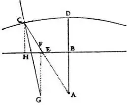 On veut tracer la normale d'une conchoïde de Nicomède de pôle A et de module b en un point C. La droite directrice de cette conchoïde sera appelée (BH), où B est de telle sorte que (AB) et (CH) soient perpendiculaires à (BH).