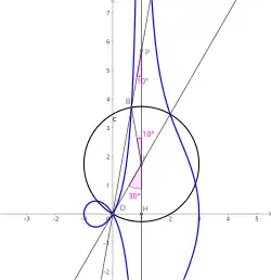 L'intersection de la courbe avec le cercle de centre I passant par O permet de déterminer deux points M et N, et grâce aux propriétés fondamentales de la conchoïde, on démontre que l'angle trisecte l'angle ou encore que l'angle est le tiers de l'angle .