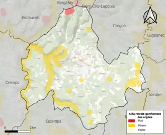 Le retrait-gonflement des sols argileux est susceptible d'engendrer des dommages importants aux bâtiments en cas d’alternance de périodes de sécheresse et de pluie. 14,7 % de la superficie communale est en aléa moyen ou fort (67,7 % au niveau départemental et 48,5 % au niveau national). Sur les 327 bâtiments dénombrés sur la commune en 2019, 11 sont en aléa moyen ou fort, soit 3 %, à comparer aux 72 % au niveau départemental et 54 % au niveau national. Une cartographie de l'exposition du territoire national au retrait gonflement des sols argileux est disponible sur le site du BRGM[27],[Carte 2].