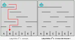 L'illustration montre à gauche en rouge le trajet parcouru par le robot dans le labyrinthe, et à droite l'autre trajet pour lequel l'enfant doit deviner « dans quelle case le robot va-t-il tomber, si Castor place son robot en haut à gauche du labyrinthe. »