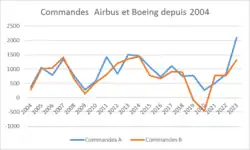 Mais depuis une vingtaine d'années on constate un coude à coude, que ce soit dans les commandes (avec un avantage pour Airbus) ou pour les livraisons depuis les années 2000, sauf exceptions, et un effondrement des commandes dû à la crise économique de 2008 et à la crise sanitaire en 2020.