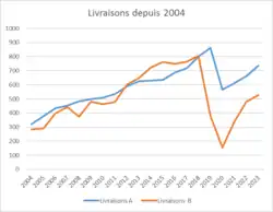 Par exemple en 1991, 1992, 1993 au niveau des commandes, et jusqu'en 2002 au niveau des livraisons.