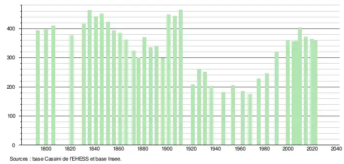 L'évolution du nombre d'habitants est connue à travers les recensements de la population effectués dans la commune depuis 1793. Pour les communes de moins de 10 000 habitants, une enquête de recensement portant sur toute la population est réalisée tous les cinq ans, les populations de référence des années intermédiaires étant quant à elles estimées par interpolation ou extrapolation[22]. Pour la commune, le premier recensement exhaustif entrant dans le cadre du nouveau dispositif a été réalisé en 2004[23].